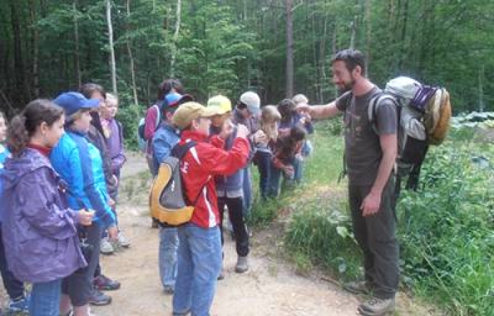 Balade 5 sens, l'arbre est un être vivant (son fonctionnement), reconnaissance des arbres, sortie nocturne en forêt, les petites bêtes des bois et de la litière forestière, traces et indices de présence des animaux forestiers, la mare forestière et le ruisseau du Moulinet.